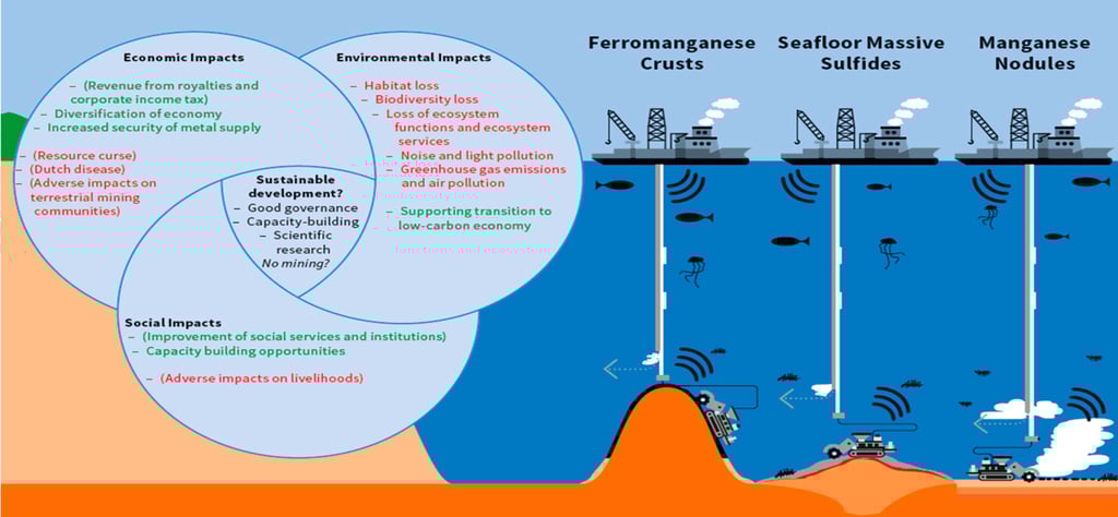 Overview of marine mineral deposits, mining methods and impacts. Positive and negative impacts are shown in green and red, respectively. (from Heinrich and Koschinsky, 2022, DOI:10.3390/books978-3-03897-877-0)